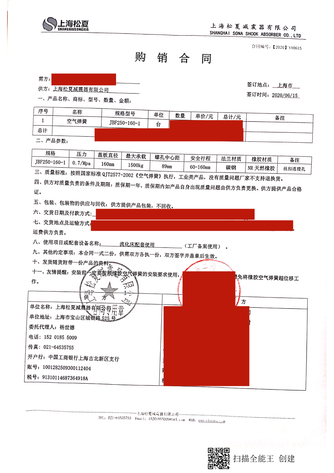 【流化床設備配套】上海松夏JBF250/160-1型空氣彈簧合同介紹: